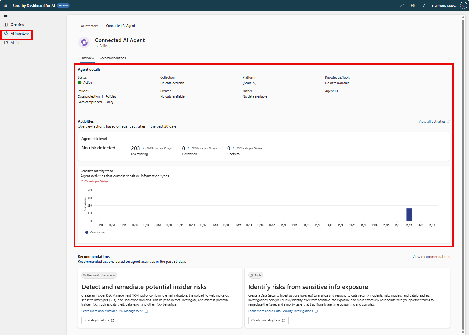 L’onglet Overview propose un scorecard de risque IA immédiatement lisible. Il évalue le niveau de mise en œuvre des fonctionnalités de sécurité IA de Microsoft et délivre des recommandations concrètes pour renforcer la posture de sécurité.